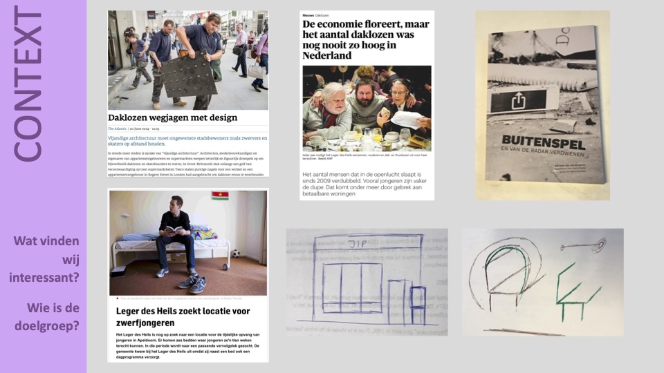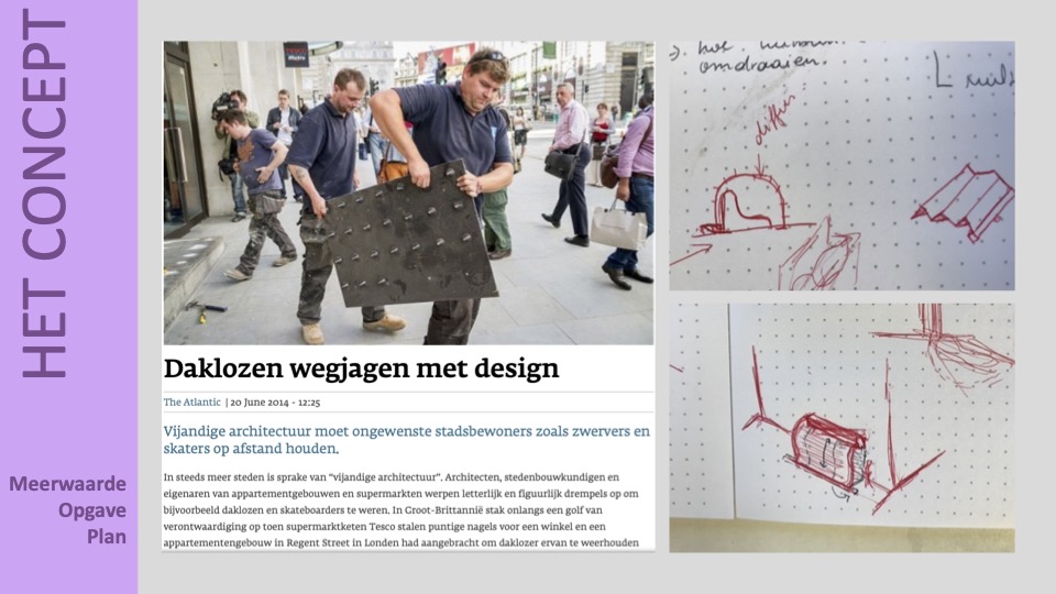 Dit project is een onderdeel van ArtEZ VOID. Een project waar meerdere architectuur disciplines uit verschillende leerjaren samenwerken voor een echte opdrachtgever om een maatschappelijk probleem te verkleinen of een poging doen tot het oplossen van het probleem. Samen met Brenda Santos, Martin Verkuil, Nika vd Einden en Samer Mohammed hebben wij de S-module ontworpen. In plaats van de zwerfjongeren weg jagen willen wij ze thuis laten voelen in de openbare ruimte. Dit hebben wij gedaan door middel van een scherm achter een bankje te hangen dit scherm kun je omhoog trekken en in een ronde vorm over het bankje heen zetten. Op deze manier kunnen de jongeren droog slapen. Het is niet de bedoeling dat de jongeren er gaan wonen maar het is wel de bedoeling dat het als een soort bewustwordingscampagne door verschillende dorpen en steden van Nederland reist. Op de grond staat een tekst met uitleg over zwerfjongeren zodat mensen zichzelf hierover kunnen informeren.